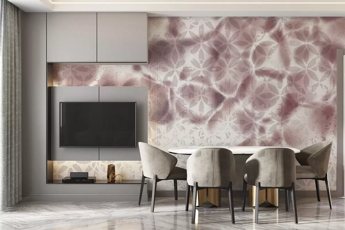 Fototapety Abstraktní texturované umění s květinovým potiskem bordo, vybledlým a rozmazaným efektem, vytvářejícím jemnou a zasněnou atmosféru Č. w09322v1