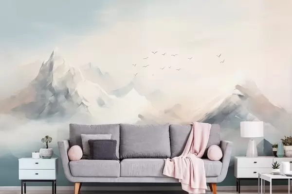Fototapety Zasněžené vrcholky hor v ranní mlze se vznášejícími se ptáky Č. w09326
