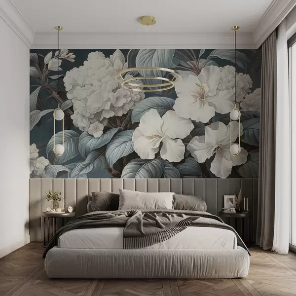 Fototapety Bílé tropické květy s jemnými okvětními lístky a listy na tmavě modrém pozadí, vintage texturovaný styl, botanická ilustrace Č. w09334