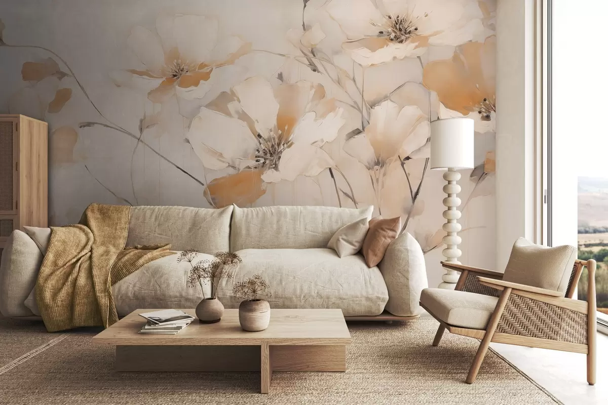 Fototapety Bílé a oranžové strukturované květy s dlouhými stonky, světlé pozadí, jemné barvy, elegantní kompozice, jemné tahy štětcem Č. w09335