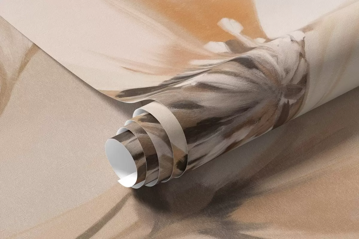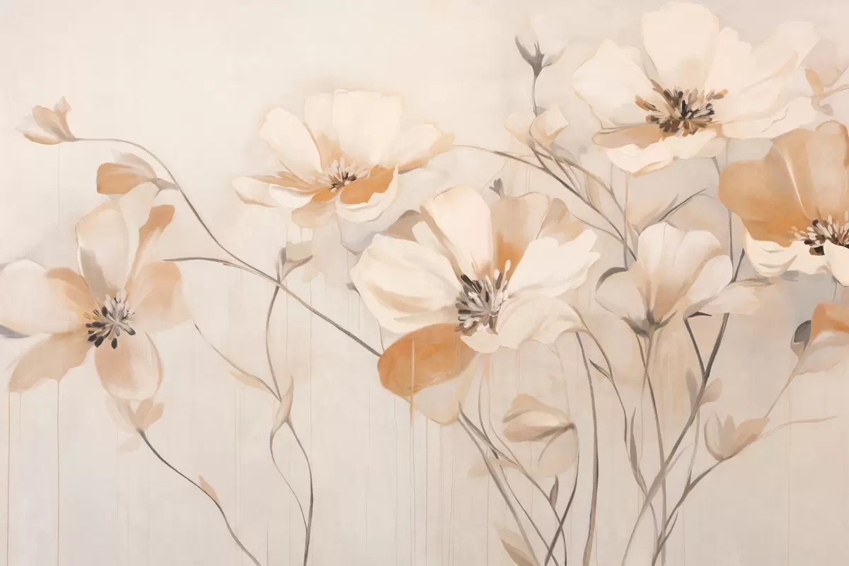 Fototapety Bílé a oranžové strukturované květy s dlouhými stonky, světlé pozadí, jemné barvy, elegantní kompozice, jemné tahy štětcem Č. w09335