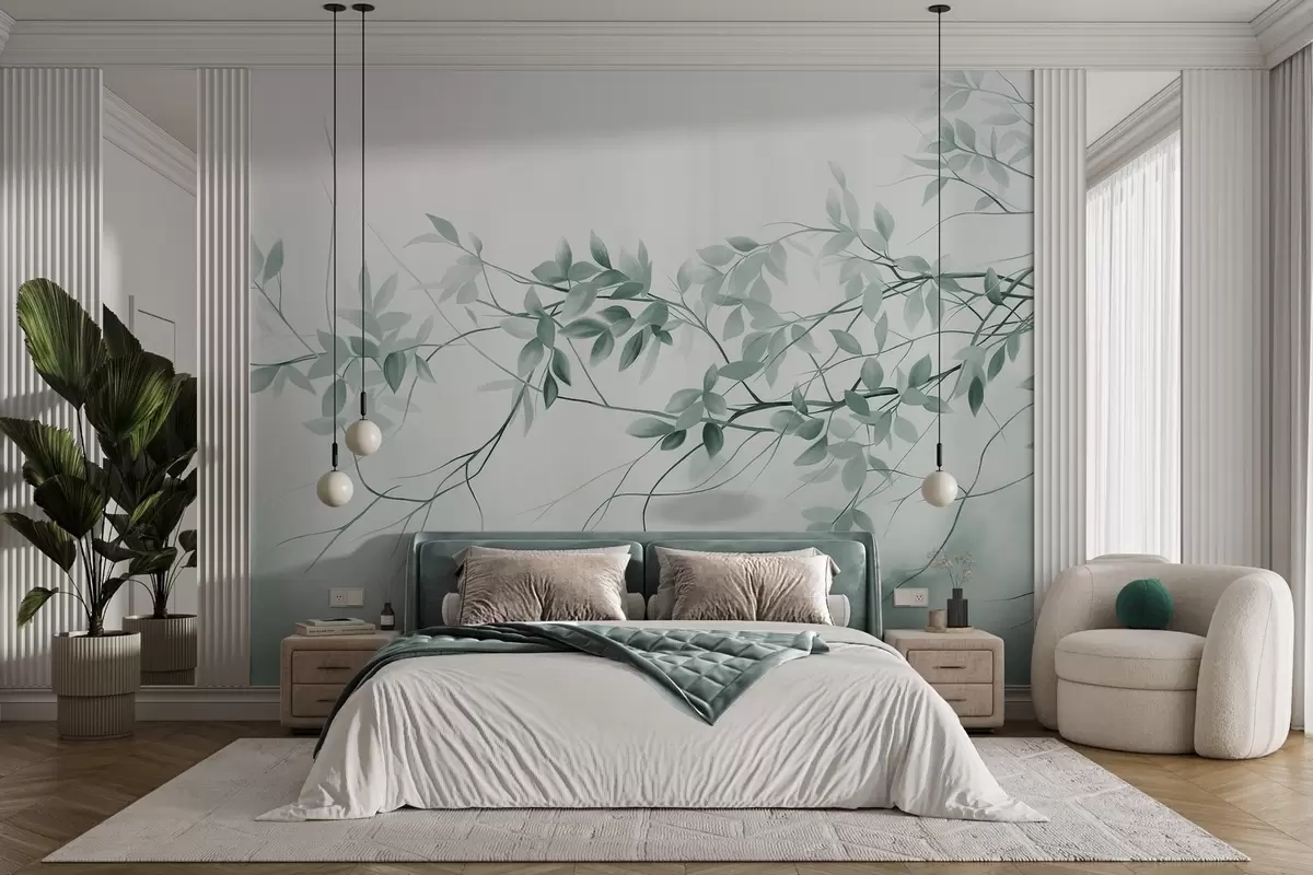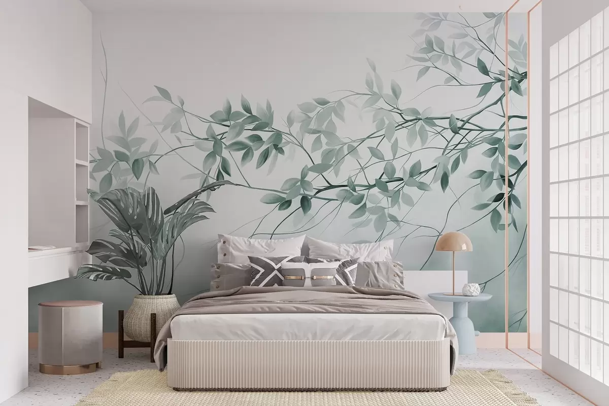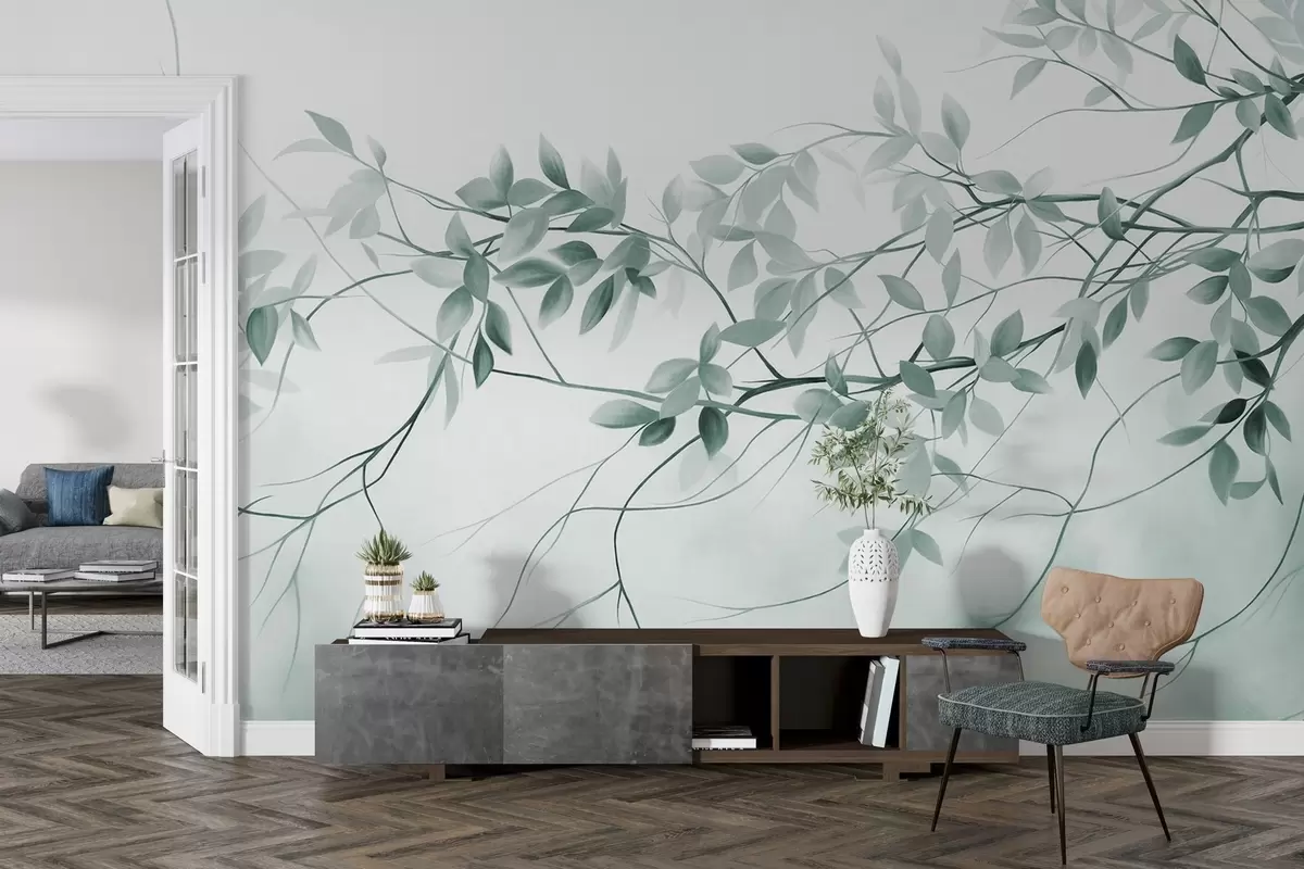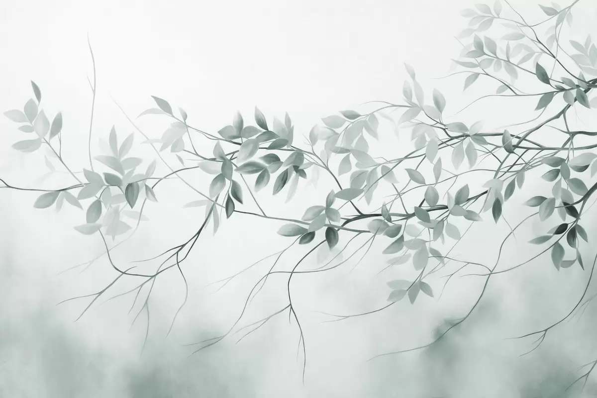 Fototapety Jemné texturované větve s tlumenými šedými a zelenými listy na měkkém, rozmazaném pozadí Č. w09336v1