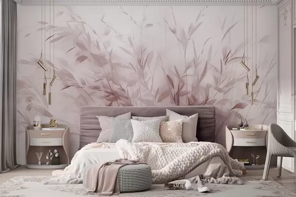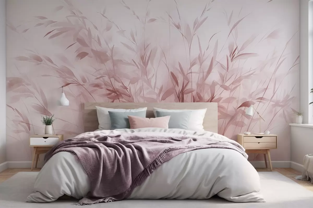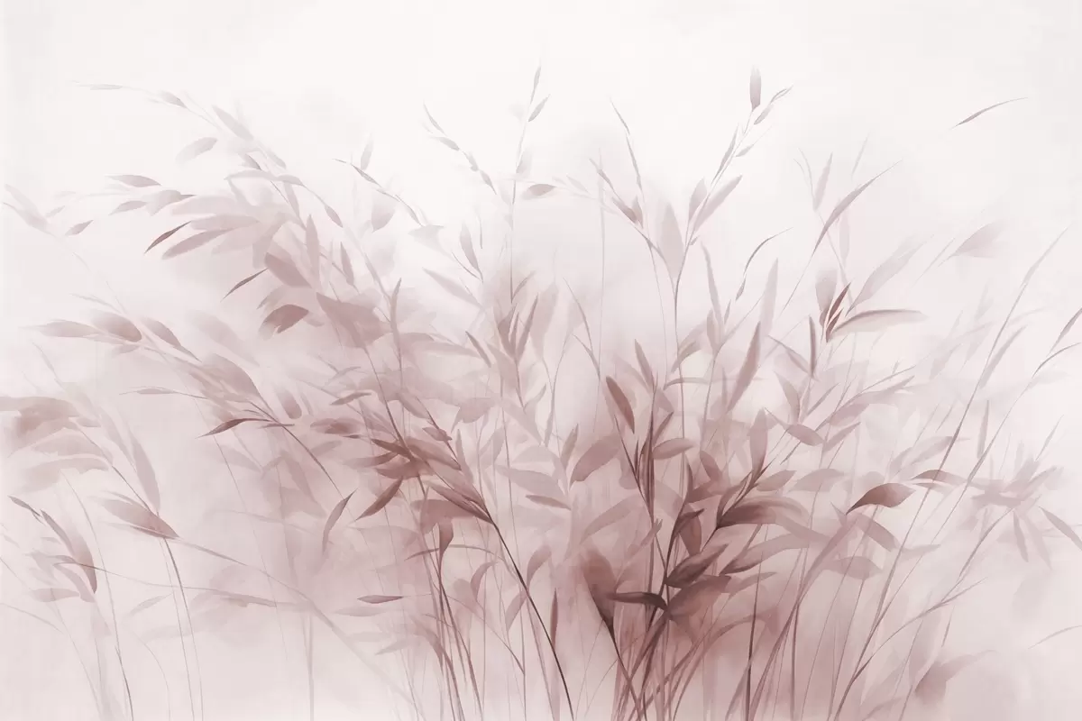 Fototapety Tráva a plevel s tenkými listy a stonky, světle růžové barvy, měkké a jemné tahy štětcem, minimalistický tisk Č. w09342v2