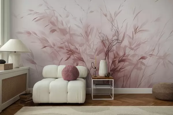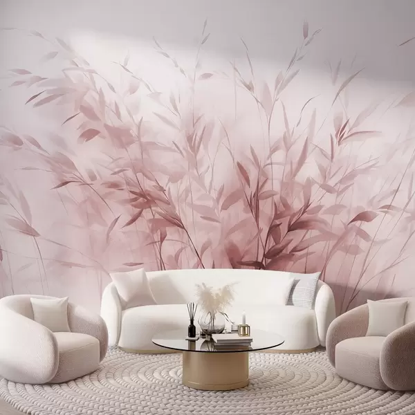 Fototapety Tráva a plevel s tenkými listy a stonky, světle růžové barvy, měkké a jemné tahy štětcem, minimalistický tisk Č. w09342v2