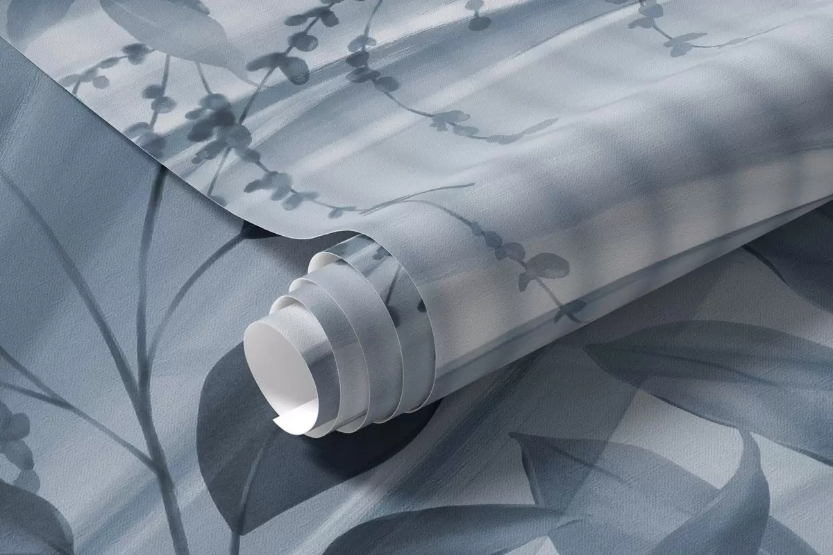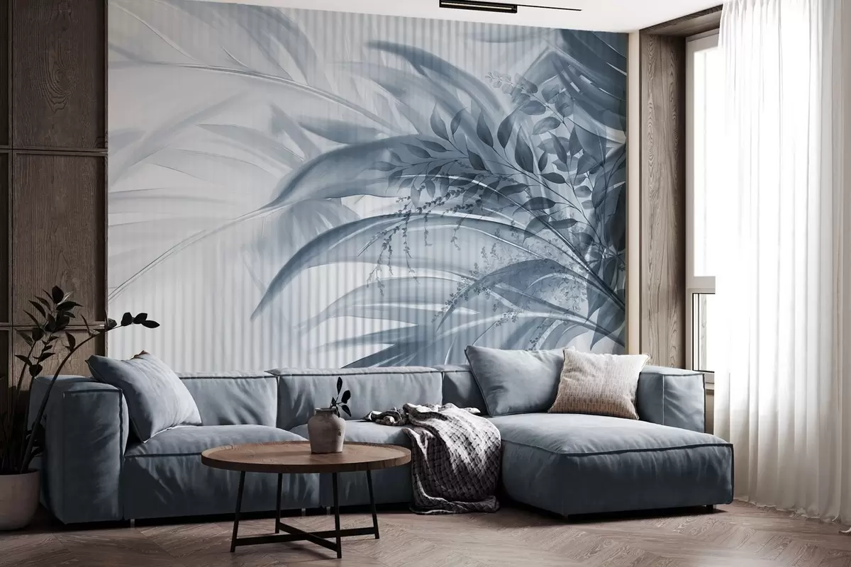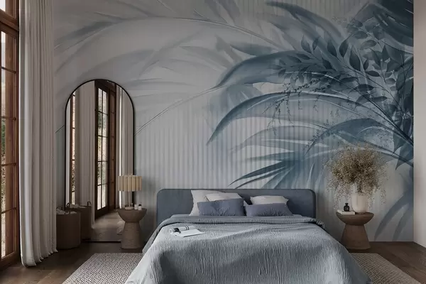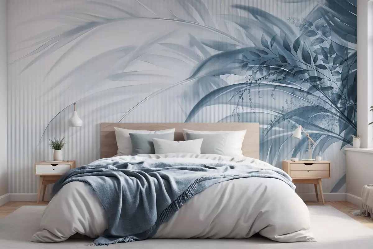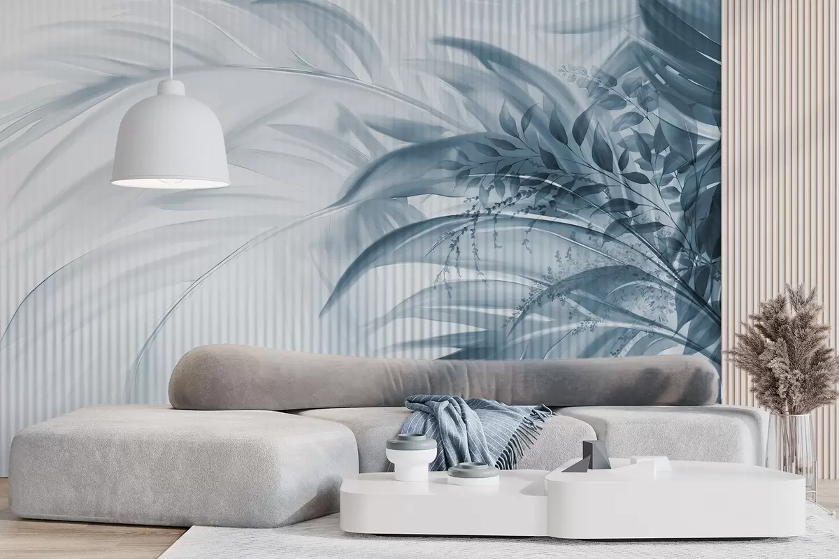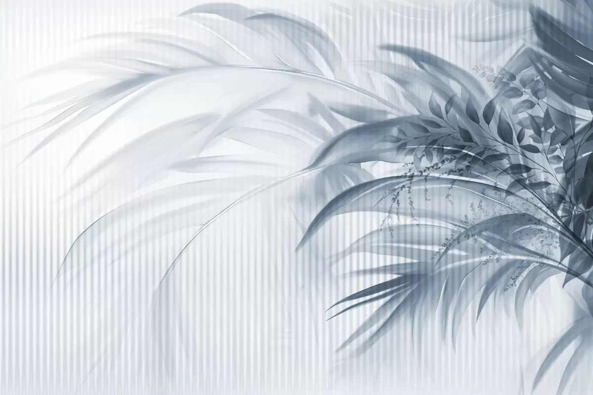 Fototapety Palmové tropické modré listy s bílým pruhovaným pozadím, měkké osvětlení, jemné tahy štětcem, organické tvary Č. w09343v1