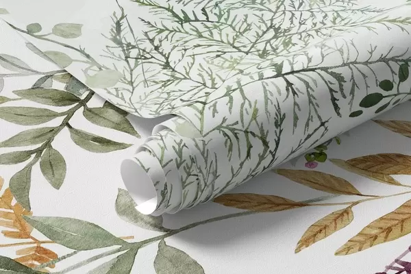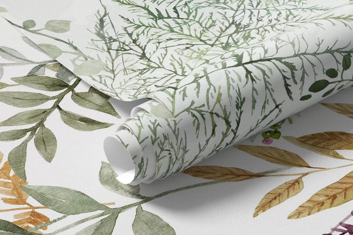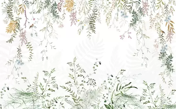 Fototapety Botanická ilustrace s kapradinami, trávou a visícími rostlinami, pastelové tóny, na bílém pozadí akvarelový texturovaný styl Č. w09364