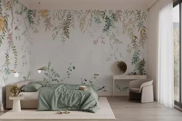 Fototapety Botanická ilustrace s kapradinami, trávou a visícími rostlinami, pastelové tóny, na bílém pozadí akvarelový texturovaný styl Č. w09364