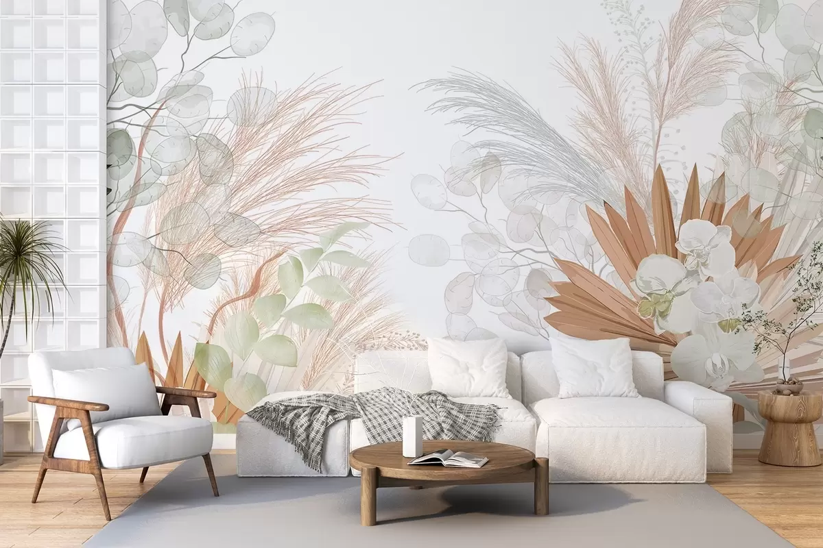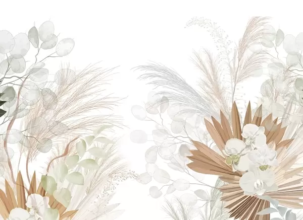 Fototapety Pampová tráva, eukalyptus, tropické listy a orchideje na bílém pozadí, pastelové barvy Č. w09366