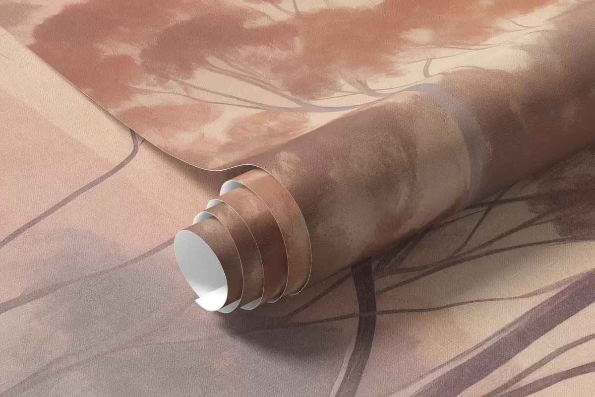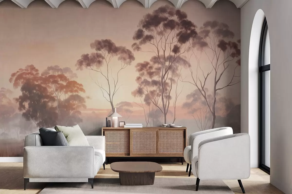 Fototapety Krajina s eukalyptovými stromy v poli s pastelově růžovou a oranžovou oblohou, lehká mlha, malba ve stylu textury Č. w09367