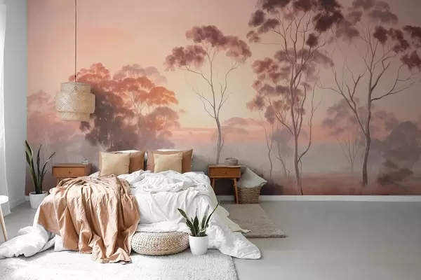 Fototapety Krajina s eukalyptovými stromy v poli s pastelově růžovou a oranžovou oblohou, lehká mlha, malba ve stylu textury Č. w09367