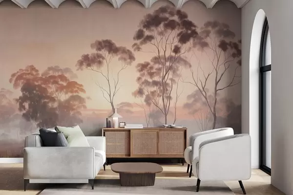 Fototapety Krajina s eukalyptovými stromy v poli s pastelově růžovou a oranžovou oblohou, lehká mlha, malba ve stylu textury Č. w09367