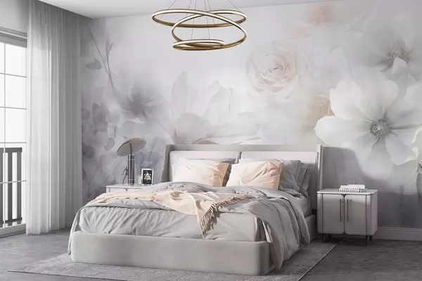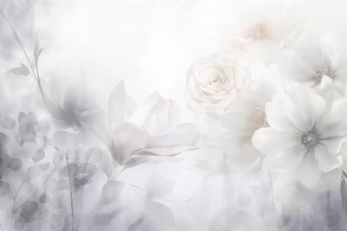 Fototapety Jemné abstraktní květinové aranžmá s pastelově růžovými růžemi a magnóliemi, měkké zaostření, světle šedé pozadí Č. w09371