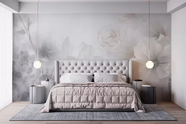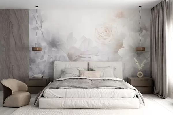 Fototapety Jemné abstraktní květinové aranžmá s pastelově růžovými růžemi a magnóliemi, měkké zaostření, světle šedé pozadí Č. w09371