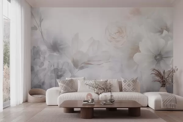 Fototapety Jemné abstraktní květinové aranžmá s pastelově růžovými růžemi a magnóliemi, měkké zaostření, světle šedé pozadí Č. w09371