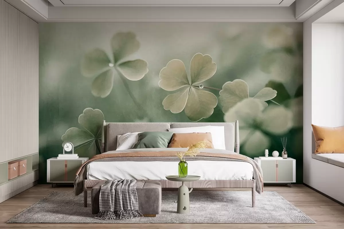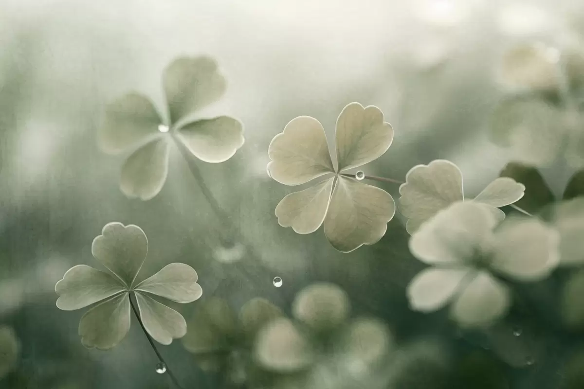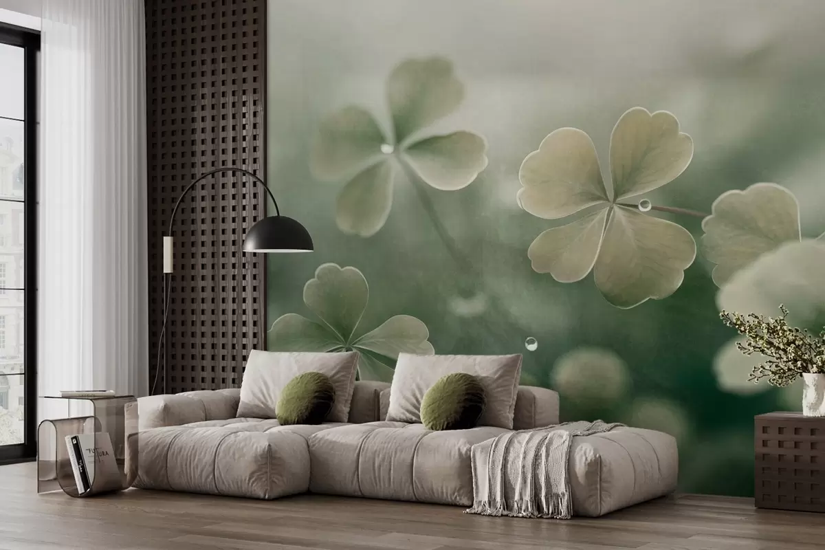 Fototapety Čtyřlístek s kapkami vody, světle zelená barva, měkké zaostření, rozmazané pozadí, texturovaný tisk Č. w09376