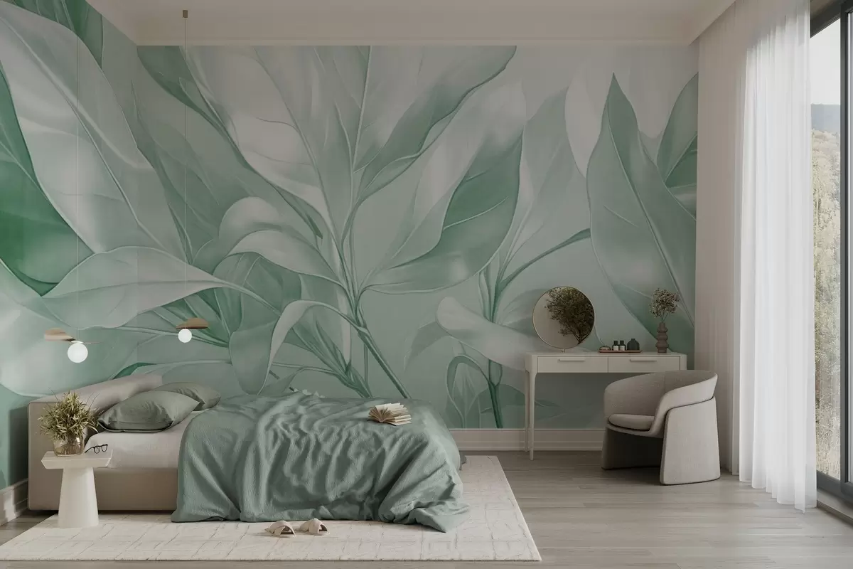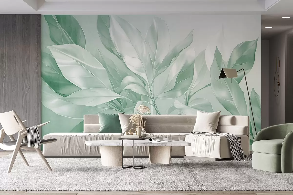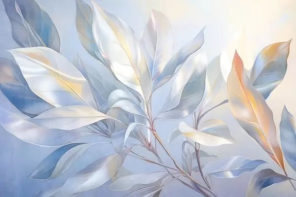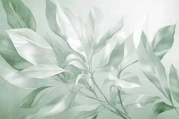 Fototapety Listy magnólie v bílých a zelených tónech, měkké osvětlení, elegantní kompozice, detailní žilkování listů, umělecké tahy štětcem Č. w09385v1