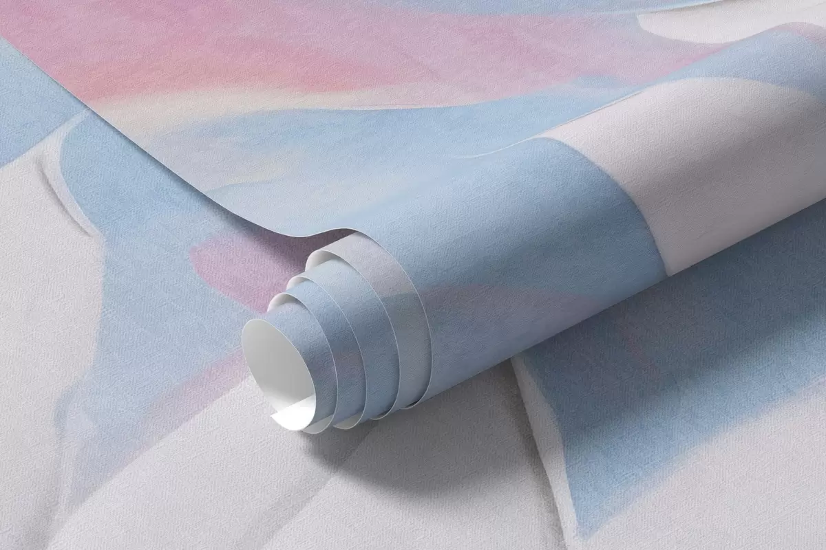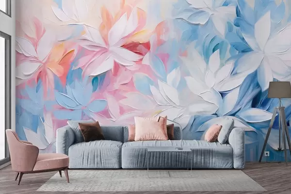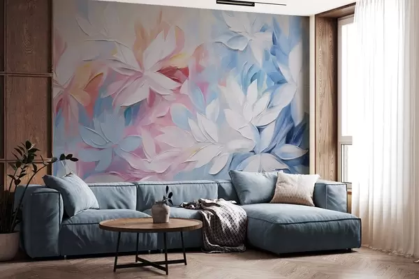 Fototapety Bílé texturované květiny s růžovými a modrými listy, abstraktní styl olejomalby, jemné tahy štětcem, pastelové barvy Č. w09396