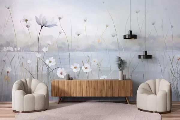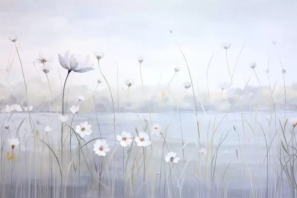Fototapety Bílé květy s dlouhými stonky na poli, světle modrá obloha, jemné barvy, texturovaný, minimalistický styl, inspirovaný přírodou, klidné pozadí Č. w09401