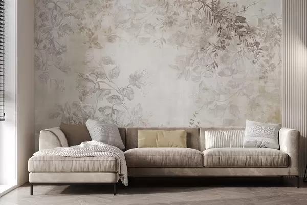 Fototapety Vintage texturované květinové umění s ilustracemi jemných zahradních květin a listů v kresebném stylu, v jemných pastelových béžových a sépiových tónech Č. w09402