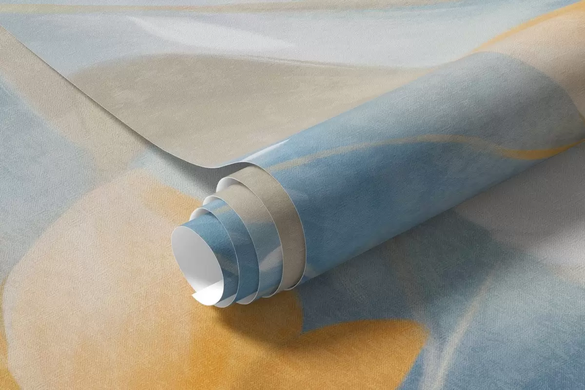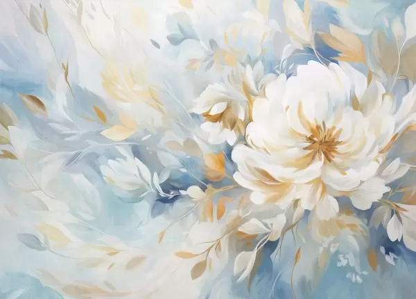 Fototapety Texturovaná bílá květina s modrými a žlutými detaily a listy na modrobílém abstraktním pozadí, malířský styl Č. w09403