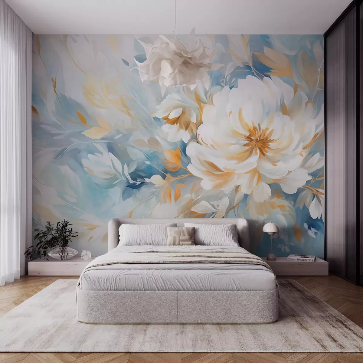 Fototapety Texturovaná bílá květina s modrými a žlutými detaily a listy na modrobílém abstraktním pozadí, malířský styl Č. w09403