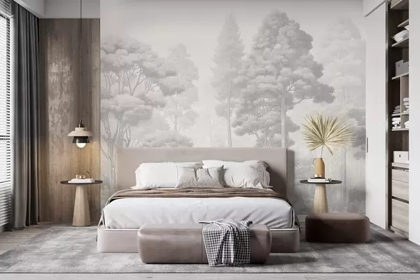 Fototapety Umělecká lesní krajina v technice černobílého grafického šrafování Č. w09411