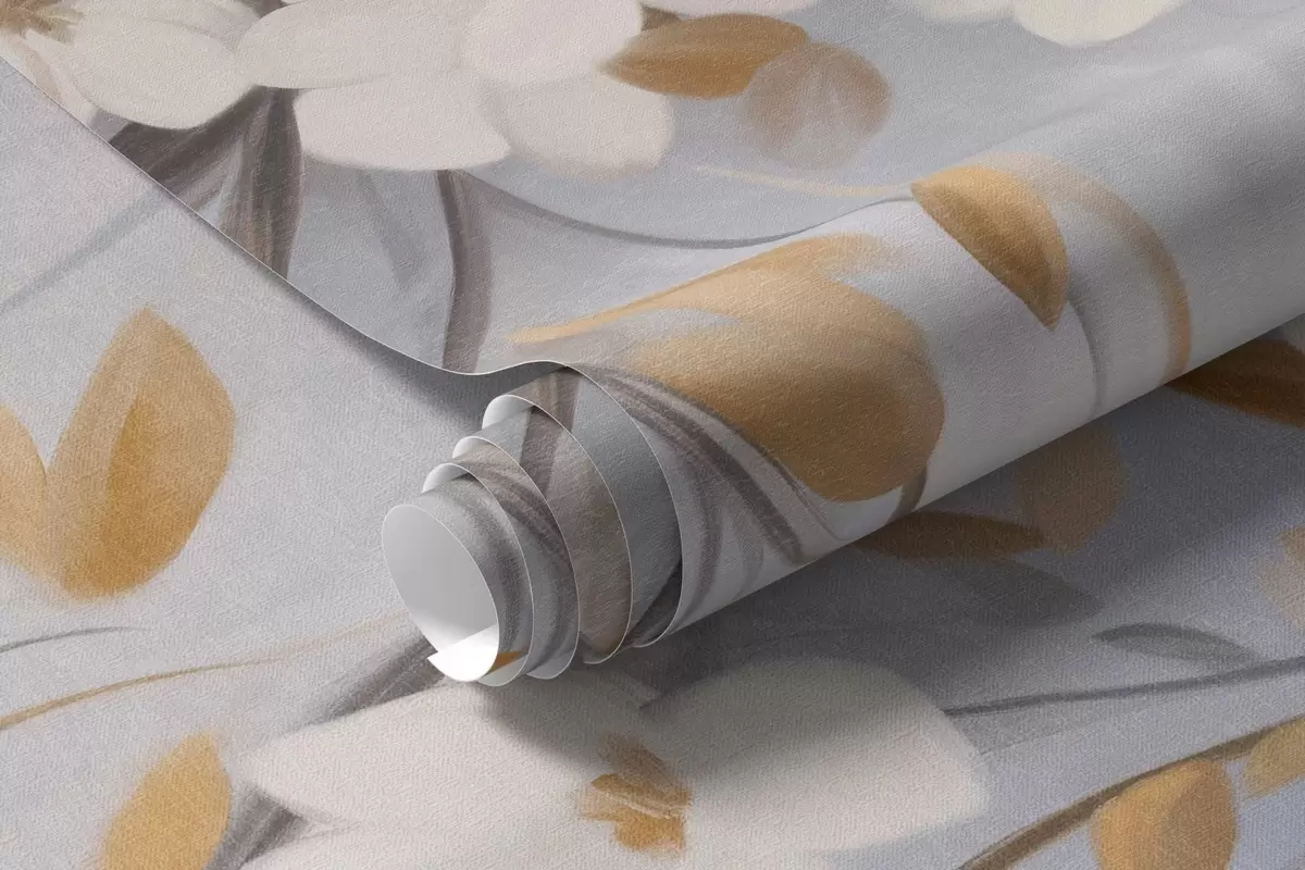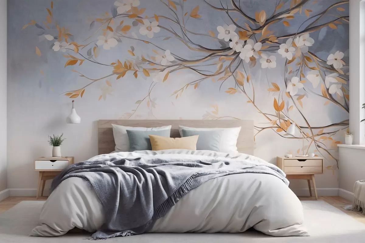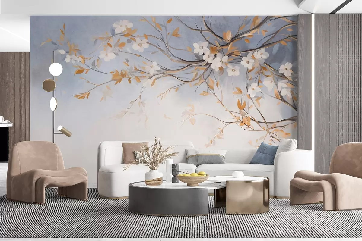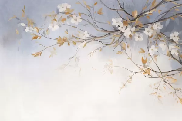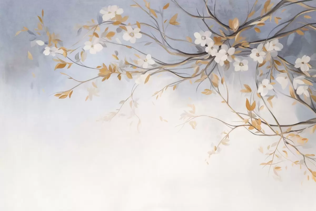 Fototapety Bílé květy s oranžovými listy na větvi stromu, světle modré texturované pozadí, jemné tahy štětcem Č. w09415