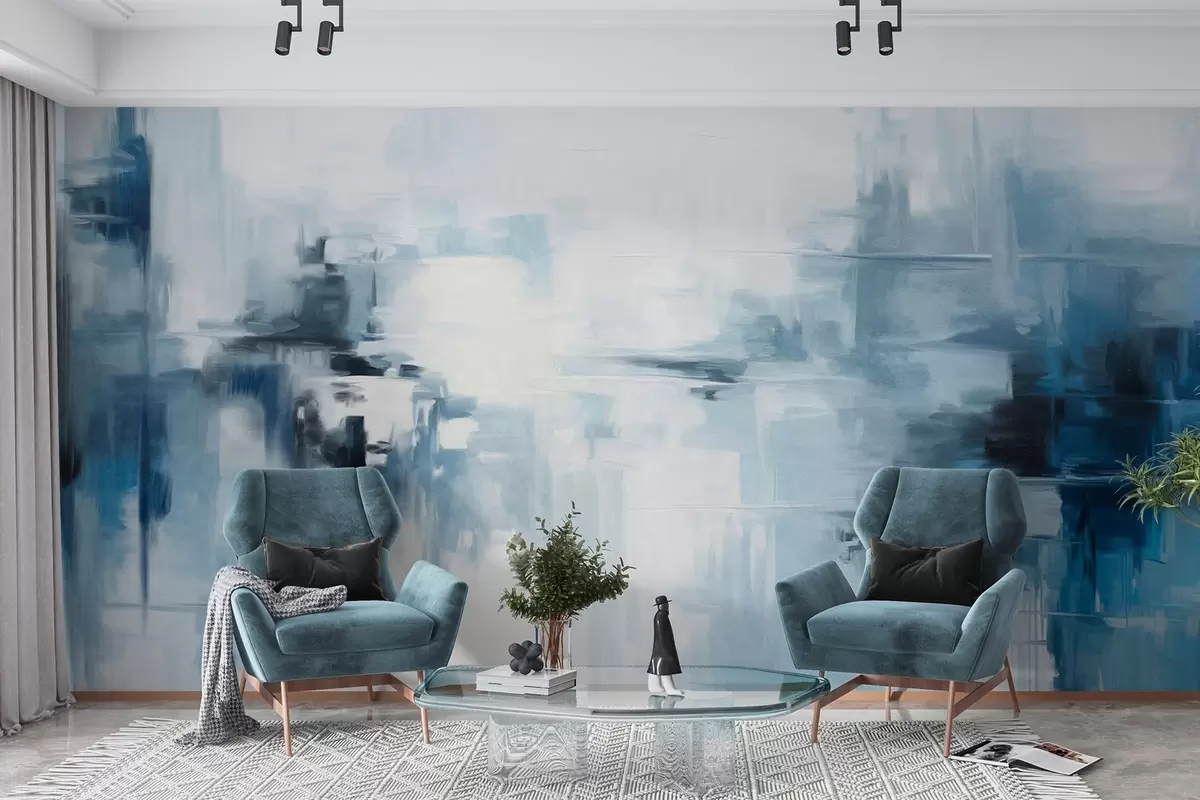 Fototapet Abstraktní texturovaná imitace krajinomalby s modrými a bílými tahy štětcem, moderní styl w09422