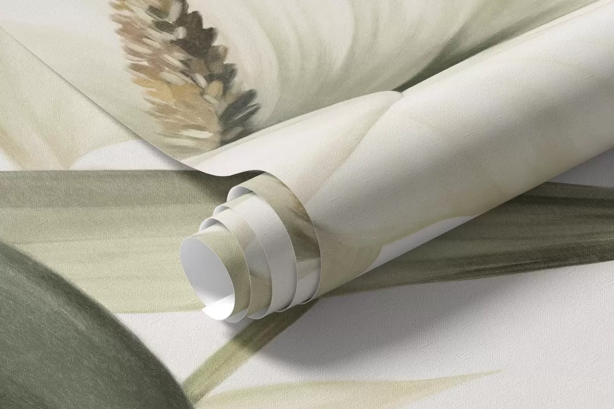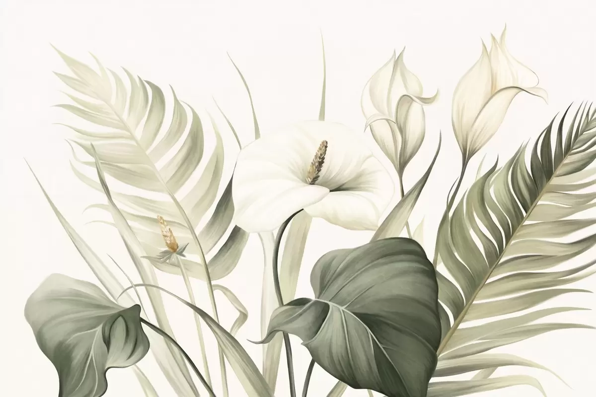 Fototapety Bílé kaly a zelené tropické listy, botanická ilustrace, světlé pozadí, vintage styl, texturované Č. w09423