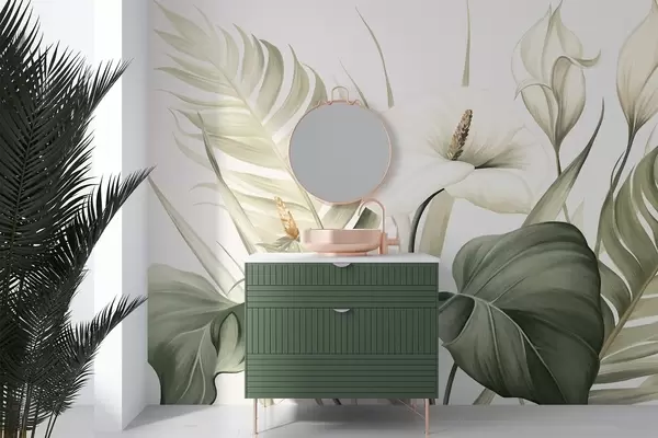 Fototapety Bílé kaly a zelené tropické listy, botanická ilustrace, světlé pozadí, vintage styl, texturované Č. w09423