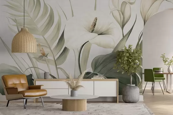 Fototapety Bílé kaly a zelené tropické listy, botanická ilustrace, světlé pozadí, vintage styl, texturované Č. w09423
