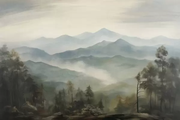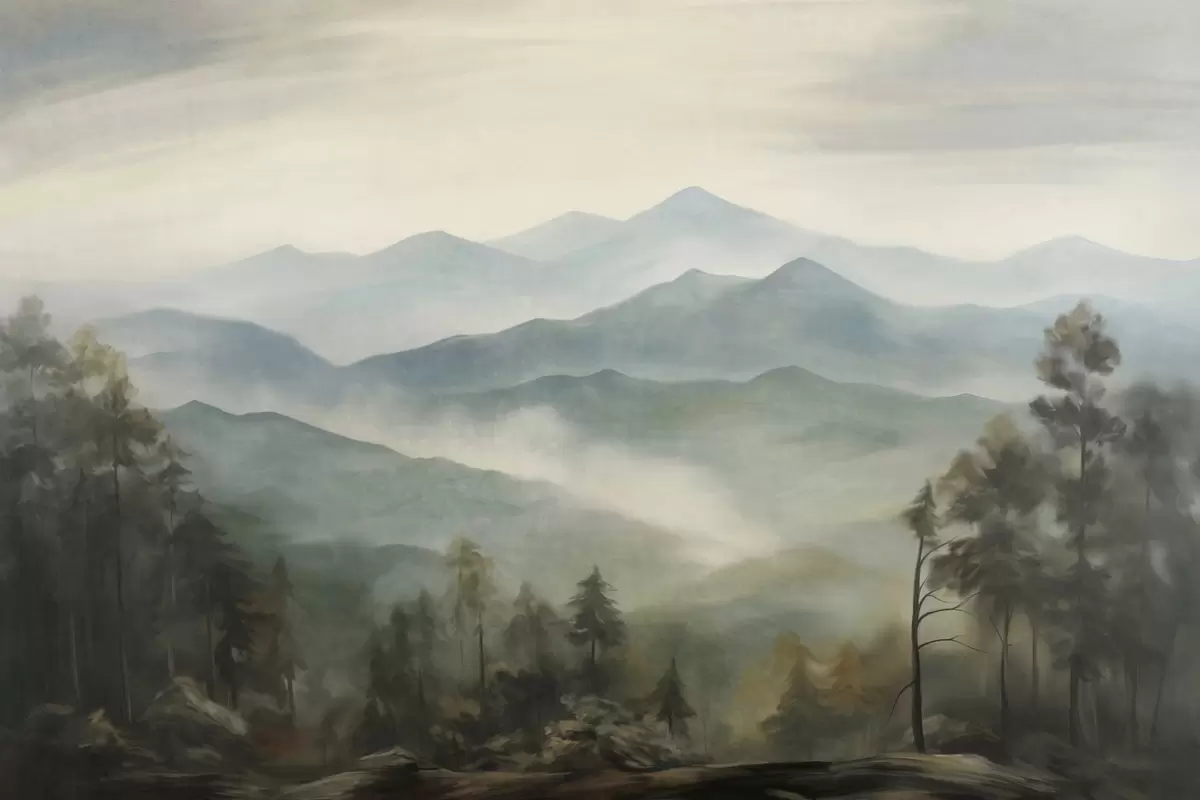 Fototapety Zamlžené pohoří se stromy, mlha, zatažená obloha, tlumené barvy, styl krajinomalby Č. w09424