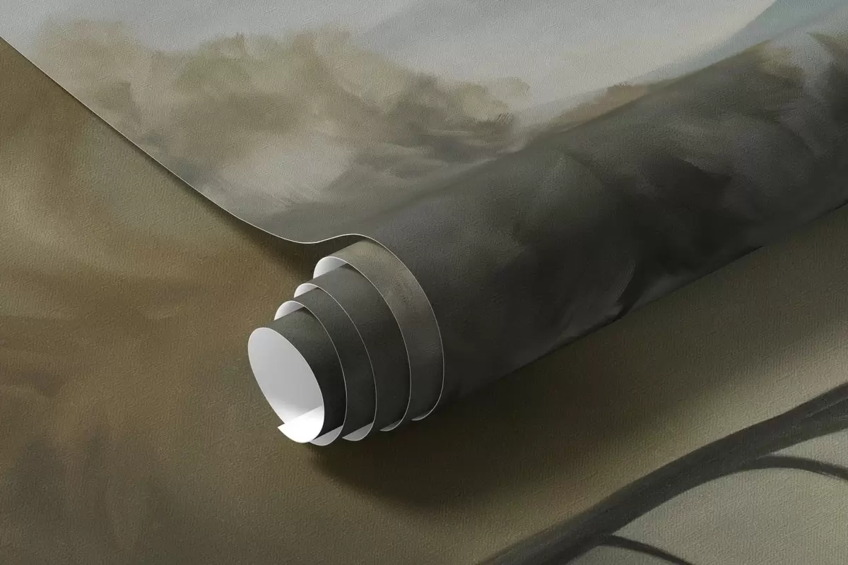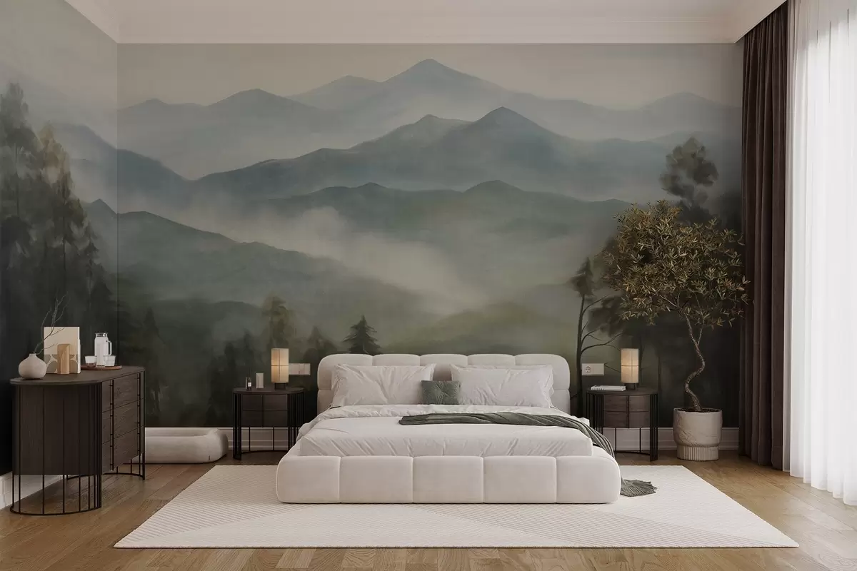 Fototapet Zamlžené pohoří se stromy, mlha, zatažená obloha, tlumené barvy, styl krajinomalby w09424