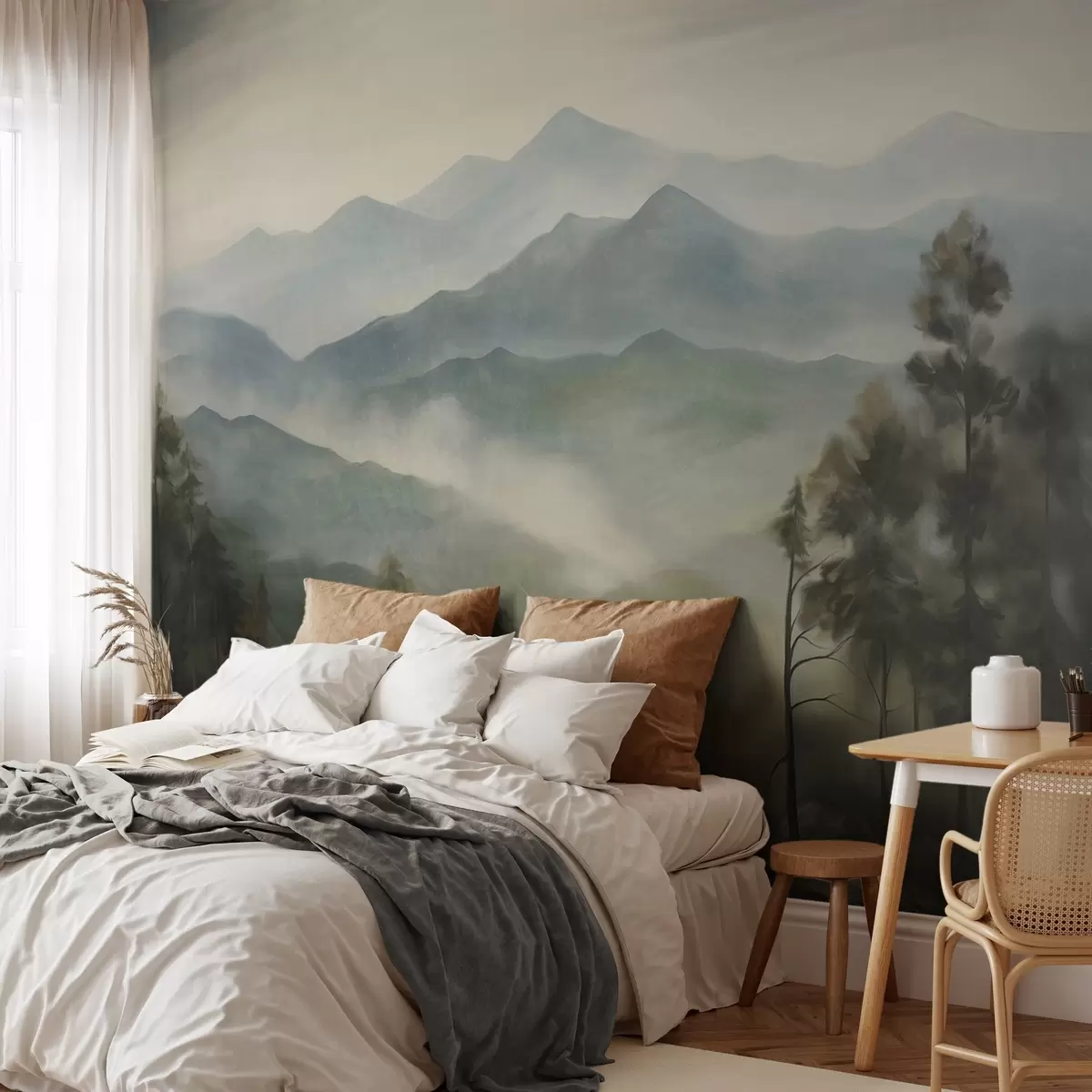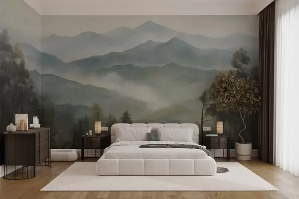 Fototapety Zamlžené pohoří se stromy, mlha, zatažená obloha, tlumené barvy, styl krajinomalby Č. w09424