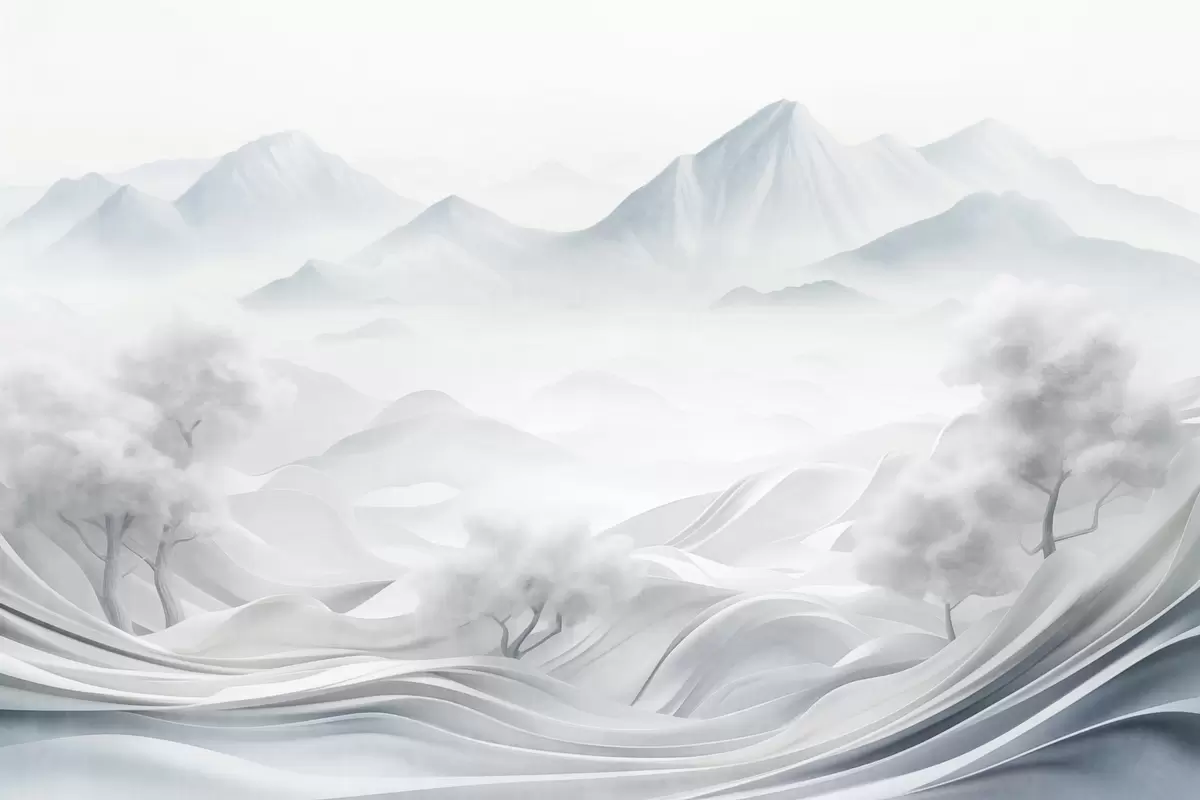 Fototapety Sněhová abstraktní dekorativní horská krajina s bílými stromy a mlhou, minimalistický texturovaný styl Č. w09426