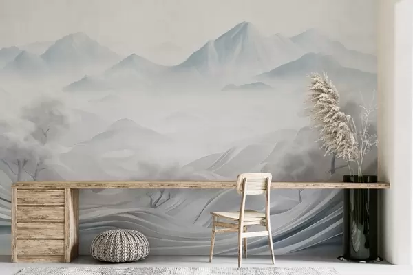 Fototapety Sněhová abstraktní dekorativní horská krajina s bílými stromy a mlhou, minimalistický texturovaný styl Č. w09426