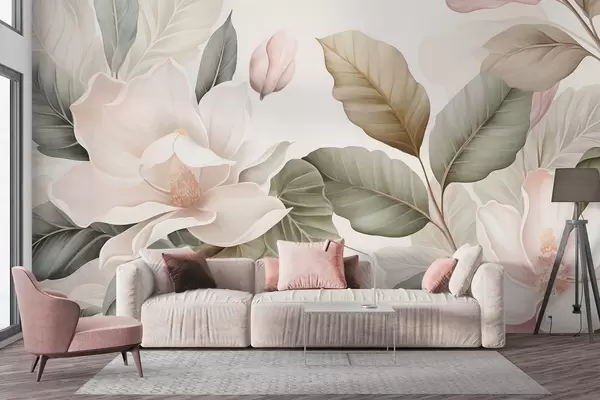 Fototapety Květy magnólie s listy v pastelových barvách, bílé, růžové a zelené, jemné, delikátní, ve stylu akvarelu Č. w09427