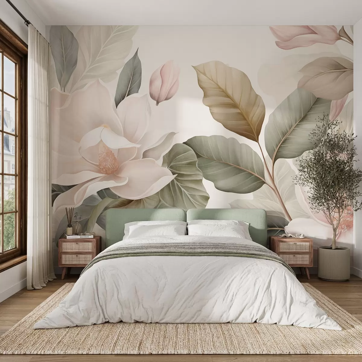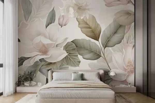 Fototapety Květy magnólie s listy v pastelových barvách, bílé, růžové a zelené, jemné, delikátní, ve stylu akvarelu Č. w09427
