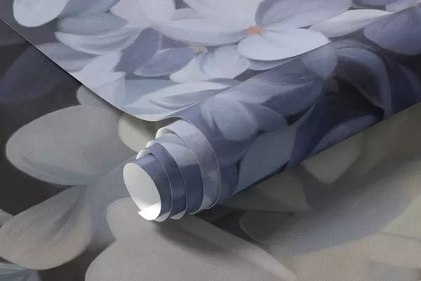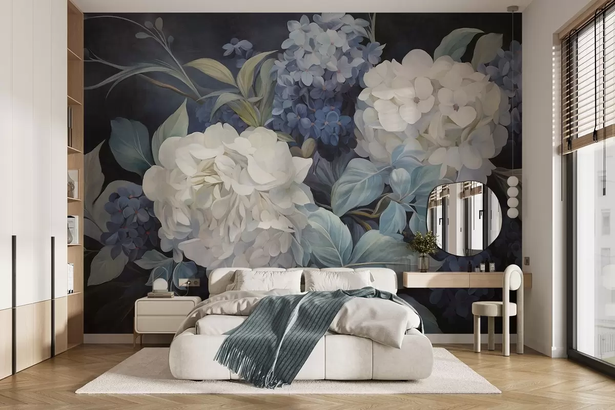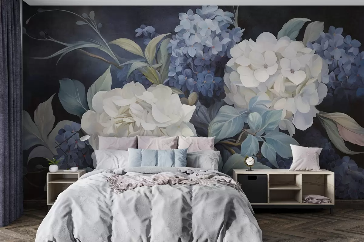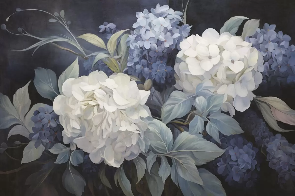 Fototapety Texturovaná tmavě modrá malba imitující květy hortenzií s velkými listy, abstraktní a tmavé pozadí Č. w09465v1