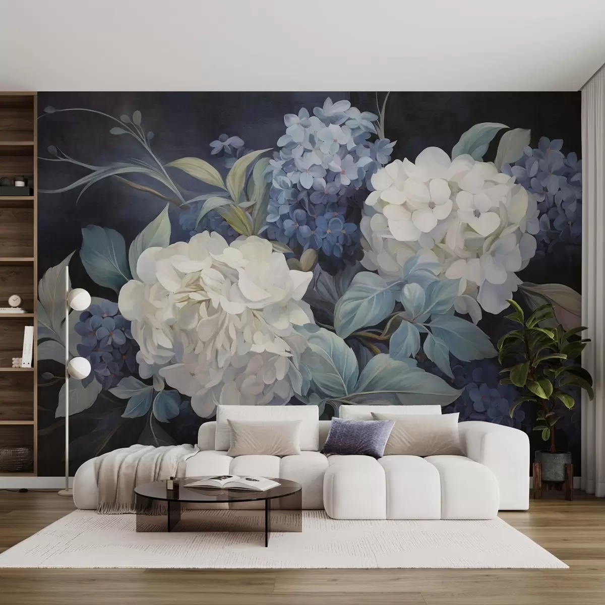 Fototapety Texturovaná tmavě modrá malba imitující květy hortenzií s velkými listy, abstraktní a tmavé pozadí Č. w09465v1