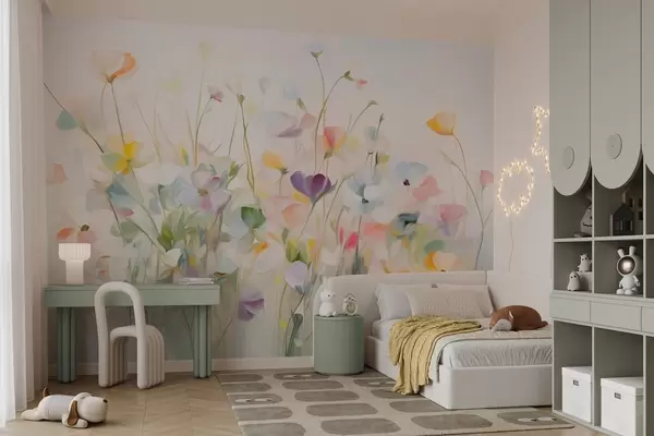 Fototapety Abstraktní pole barevných květin s dlouhými stonky a zelenými listy, texturované, pastelové, světlé barvy Č. w09466