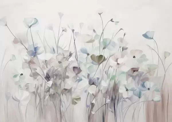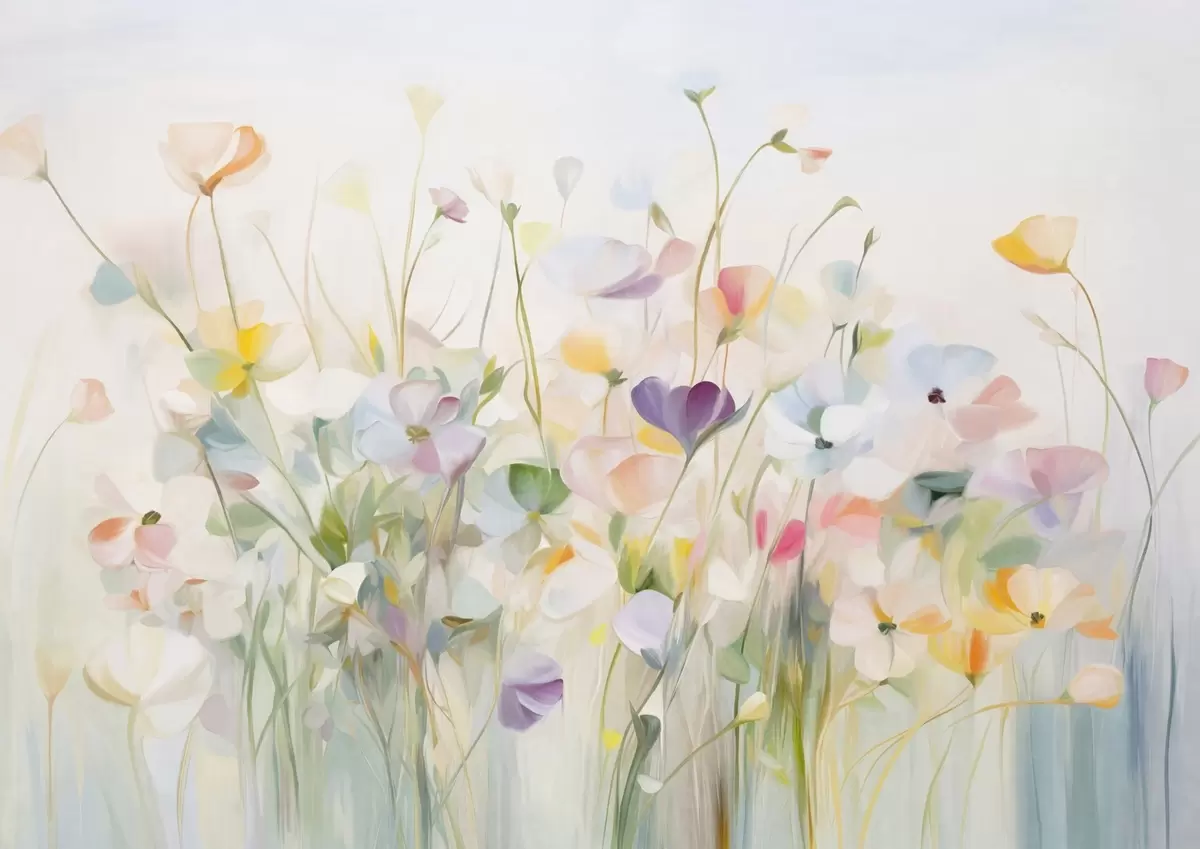 Fototapety Abstraktní pole barevných květin s dlouhými stonky a zelenými listy, texturované, pastelové, světlé barvy Č. w09466