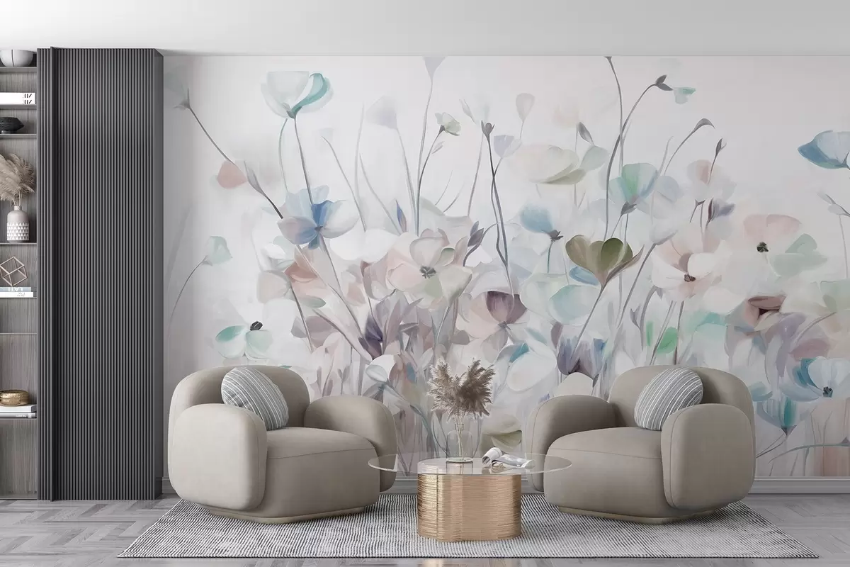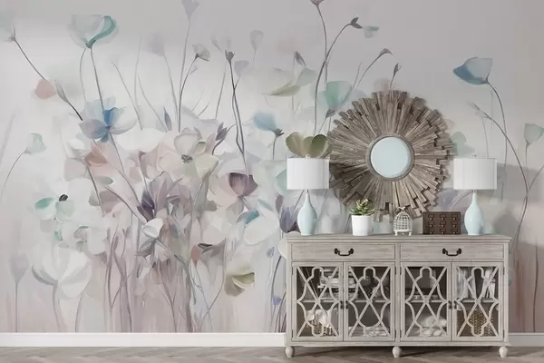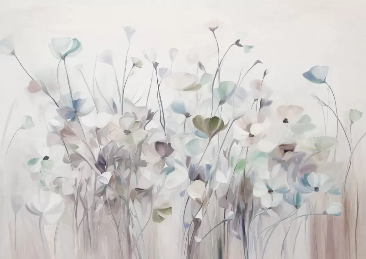 Fototapety Abstraktní pole modrých a hnědých květů s dlouhými stonky a listy, texturované, pastelové, tlumené barvy Č. w09466v1