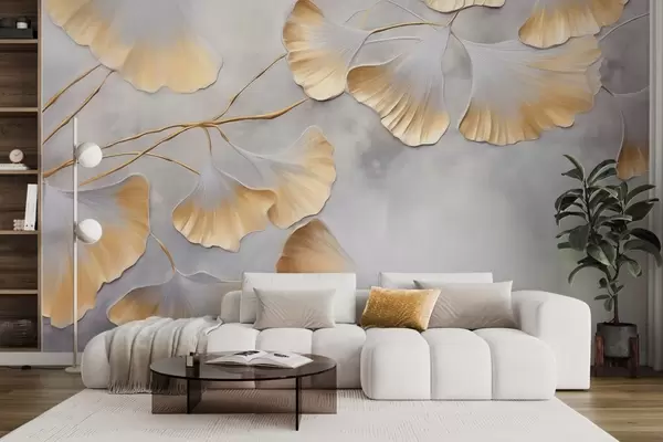 Fototapety Listy ginkga biloba se žlutými okraji na větvi, šedé texturované pozadí, elegantní a minimalistický design Č. w09472