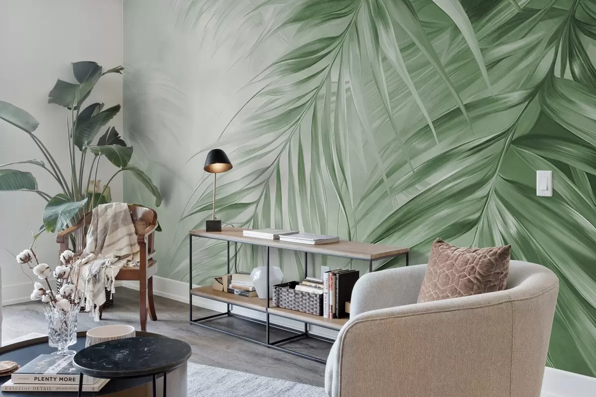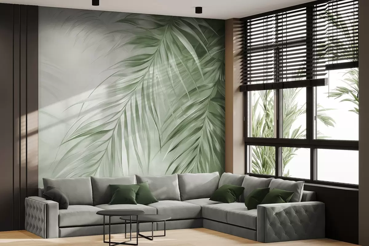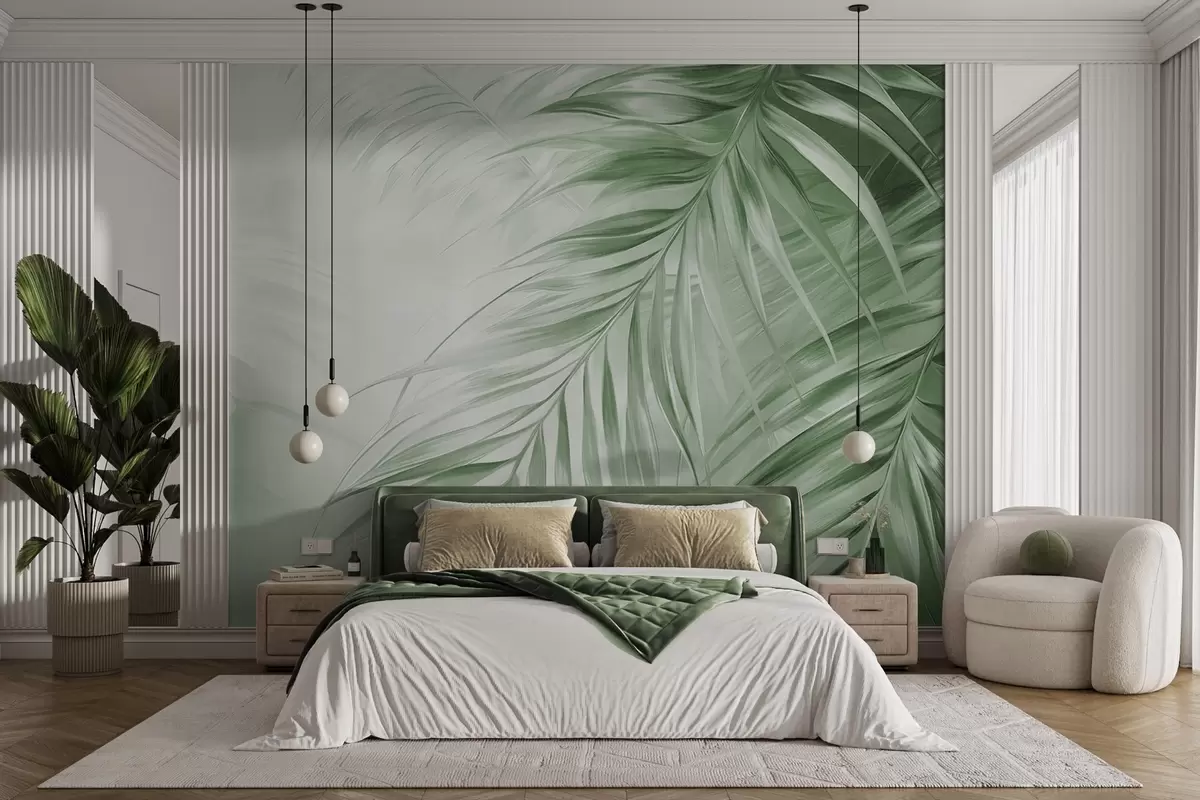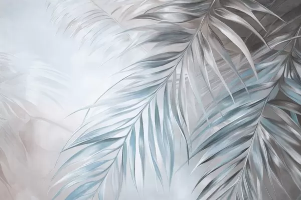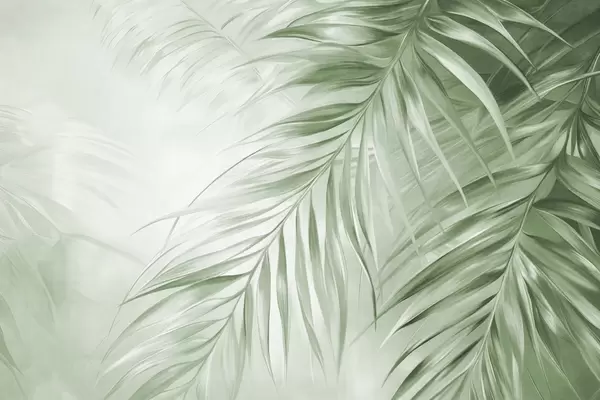 Fototapety Palmové listy se zelenými tóny, světlé texturované pozadí s jemnými barvami, elegantní tropický styl Č. w09475v2