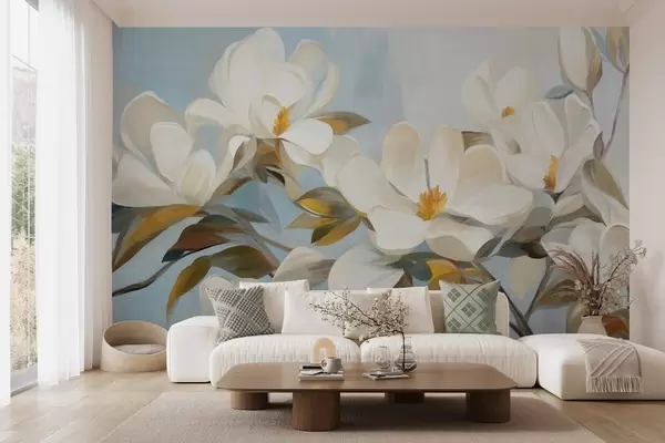 Fototapety Bílé magnólie se zelenými listy na světle modrém pozadí s abstraktními tahy štětcem Č. w09478