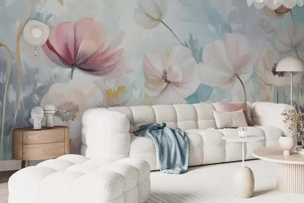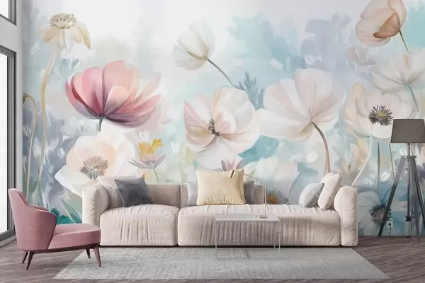 Fototapety Pole pastelově zbarvených květin s jemnými okvětními lístky a měkkými zelenými listy, namalované ve snovém, texturovaném akvarelovém stylu Č. w09481