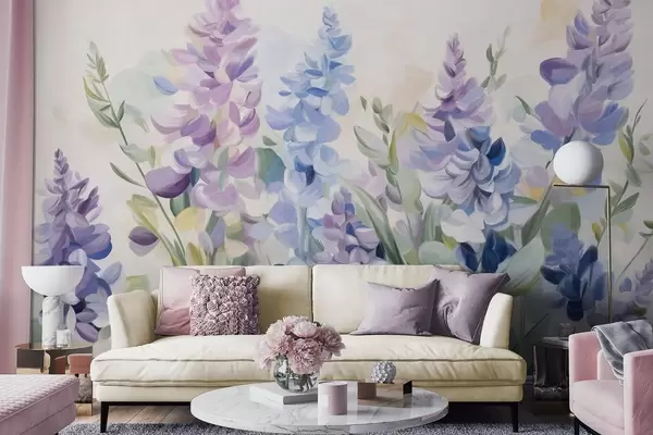 Fototapety Fialové a modré květiny s modrými listy, světlé pozadí, jemné tahy štětcem, zářivé barvy Č. w09482
