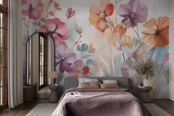Fototapety Texturovaná květinová kompozice s růžovými, fialovými a oranžovými květy se zelenými stonky a listy, jemné pastelové barvy Č. w09486