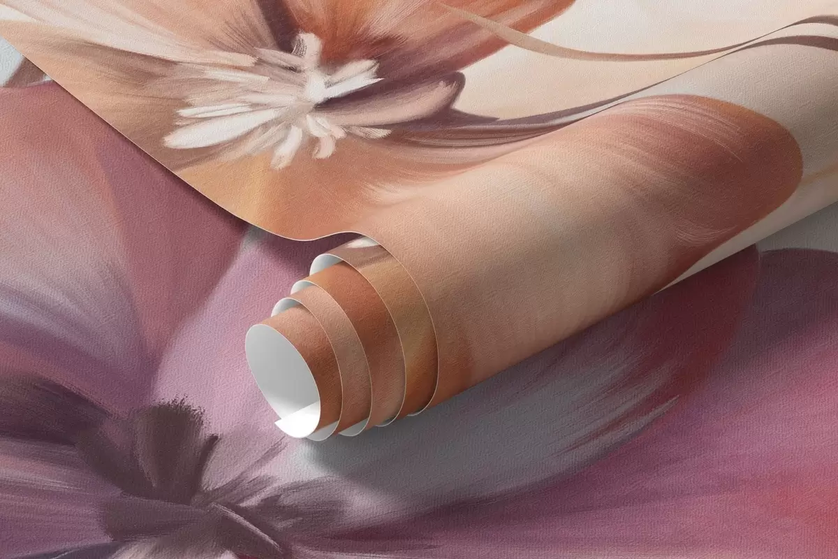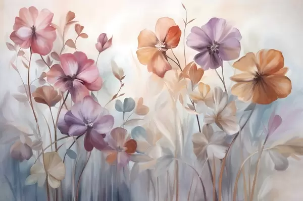 Fototapety Texturovaná květinová kompozice s růžovými, fialovými a oranžovými květy se zelenými stonky a listy, jemné pastelové barvy Č. w09486